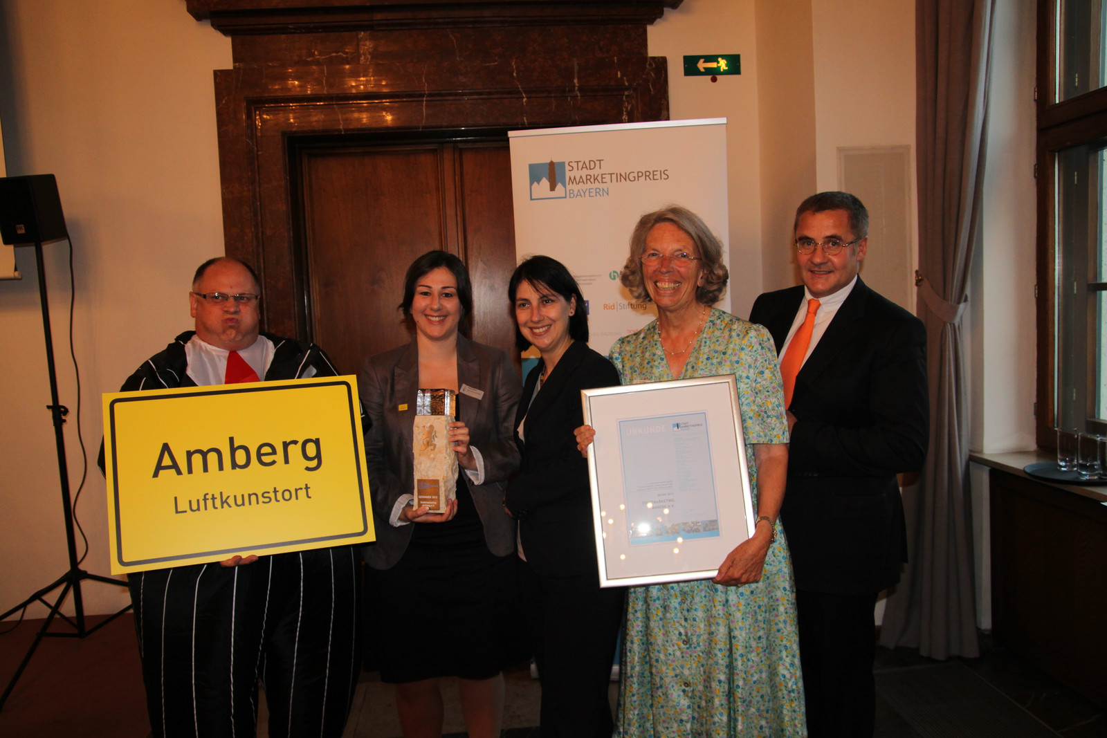 Der Abend blieb spannend bis zuletzt. Die Gewinner wurden erst nach einer Laudatio auf alle drei Nominierten auf der Bühne bekannt gegeben. Die erste Reaktion der Amberger Gewinner war ein Luftsprung. Wilhelm Koch beeindruckte die Gäste mit seinem standesgemäßen Luftanzug und dem Luftmaschenteppich. „Neben der Ehre, die uns zuteil wird, freuen wir uns sehr über das enorme Presseecho im Vorfeld unserer zweiten Luftnacht am 7. September und hoffen, somit auch Interessierte aus ganz Bayern bei der Luftnacht begrüßen zu dürfen“, freute sich Plößner. Schatz wies daraufhin, dass aus dem begrenzten Budget des Stadtmarketings mit wenig Mitteln ein Erfolgsevent mit überregionaler Reichweite geschaffen wurde.