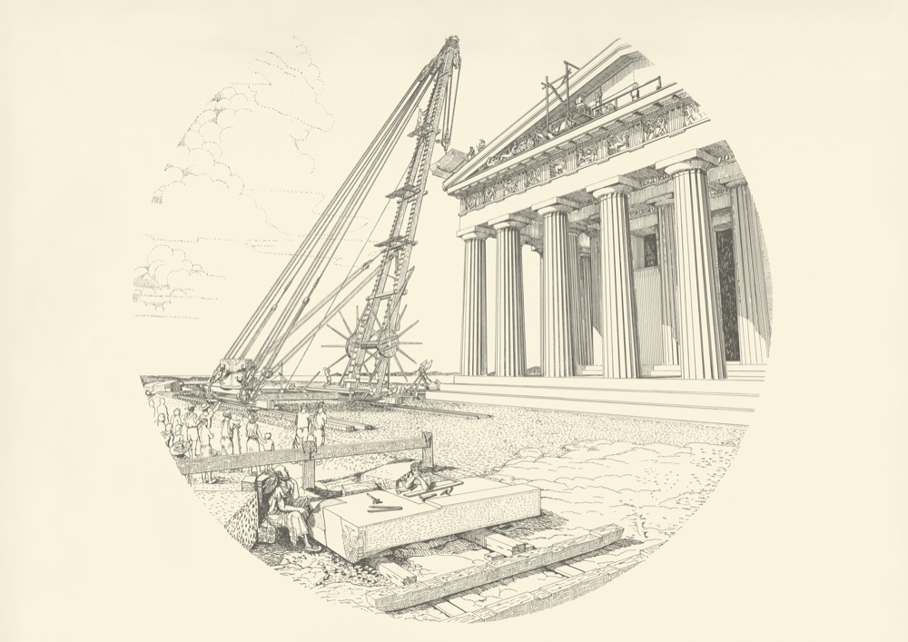 Prof. Dr. Ing. Manolis Korres hat Architektur studiert und sich der archäologischen Bauforschung zugewandt. Er war lange Jahre verantwortlich für die Restaurierungsarbeiten am Parthenon und ist heute Professor an der TU Athen am Lehrstuhl für Baugeschichte. Die in der Ausstellung gezeigten Zeichnungen erzählen die Geschichte eines Kapitells des Vorparthenon - wie das Werkstück im Steinbruch am Penteli gebrochen und zugerichtet wird, wie das halbfertige Kapitell zur Akropolis transportiert wird und dass es vor seiner endgültigen Bearbeitung schließlich wegen einer Schwachstelle im Marmor aussortiert werden muss. In äußerst anschaulichen Bildern wird so ein Einblick gegeben in die Probleme, die beim Bau eines griechischen Tempels zu bewältigen waren.