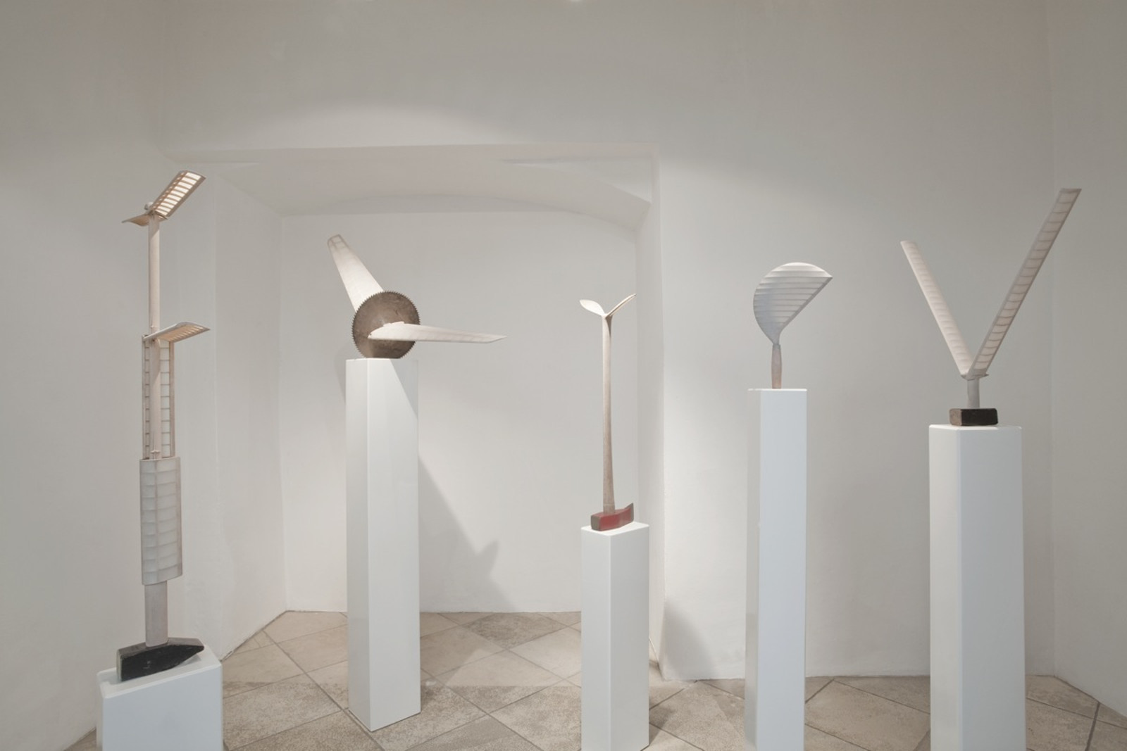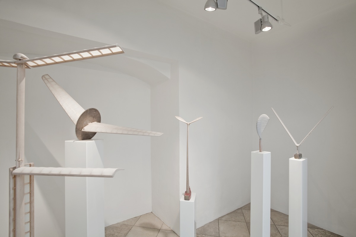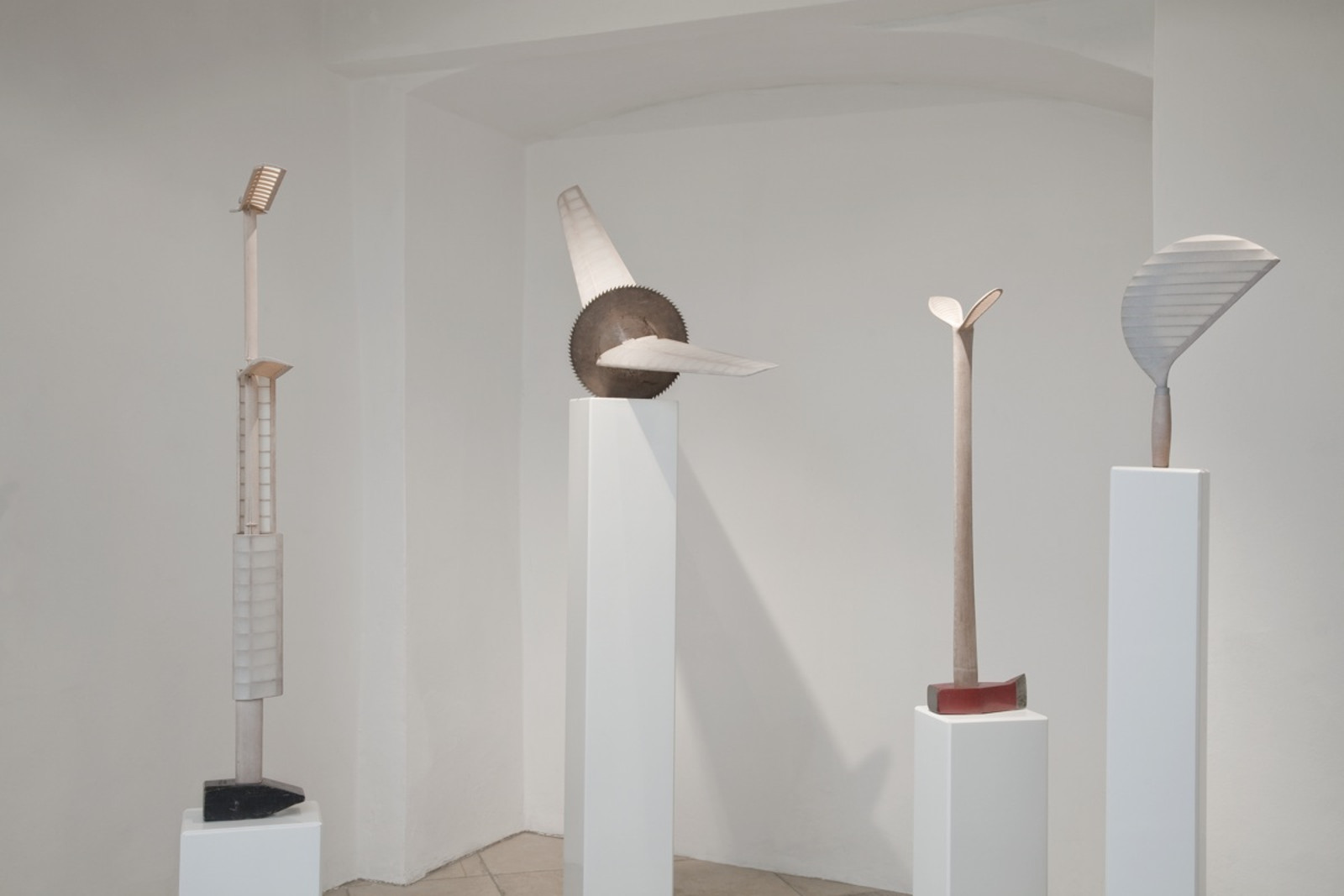 Einen Kontrast bildet ein Skulpturenzyklus, bei dem vor allem Werkzeuge zu fragilen Gebilden aus Holz und Papier umgewandelt wurden – so bekommt ein Kreissägeblatt ein Flügelpaar, aus den Stielen von Vorschlaghämmern wachsen hochaufragende Segel.