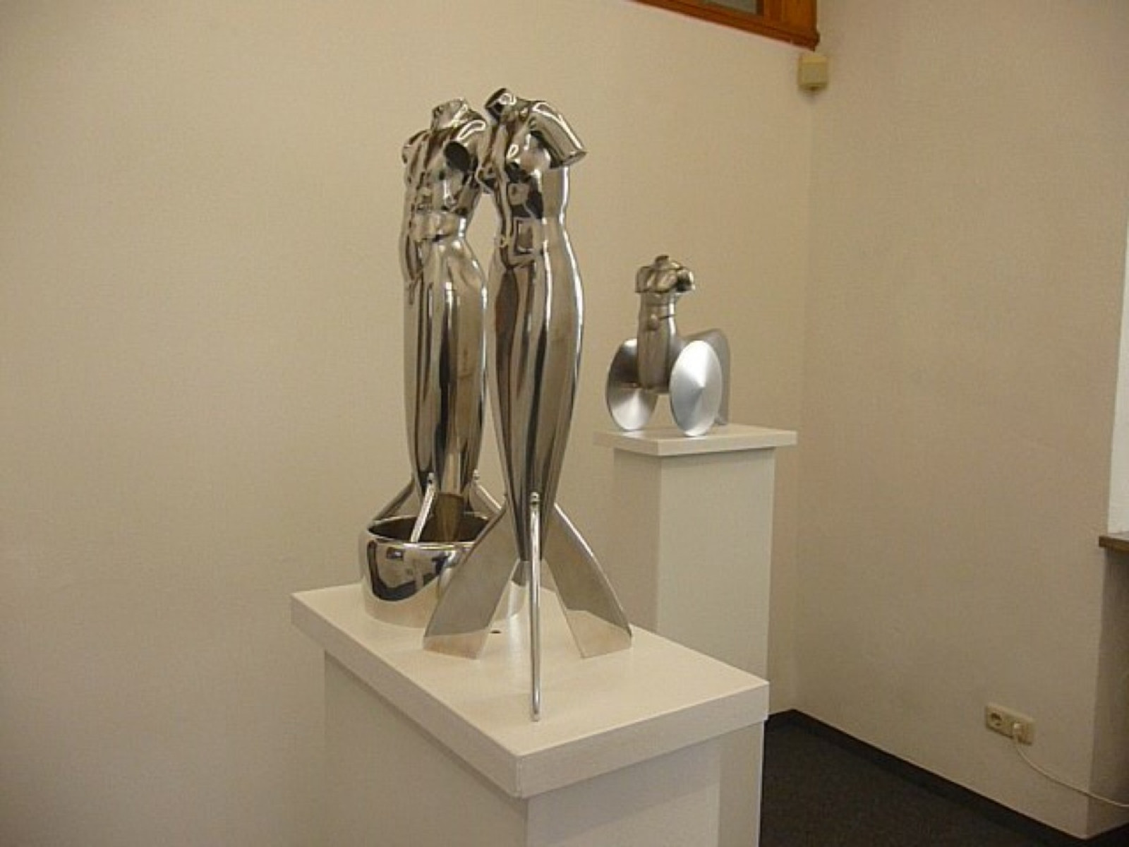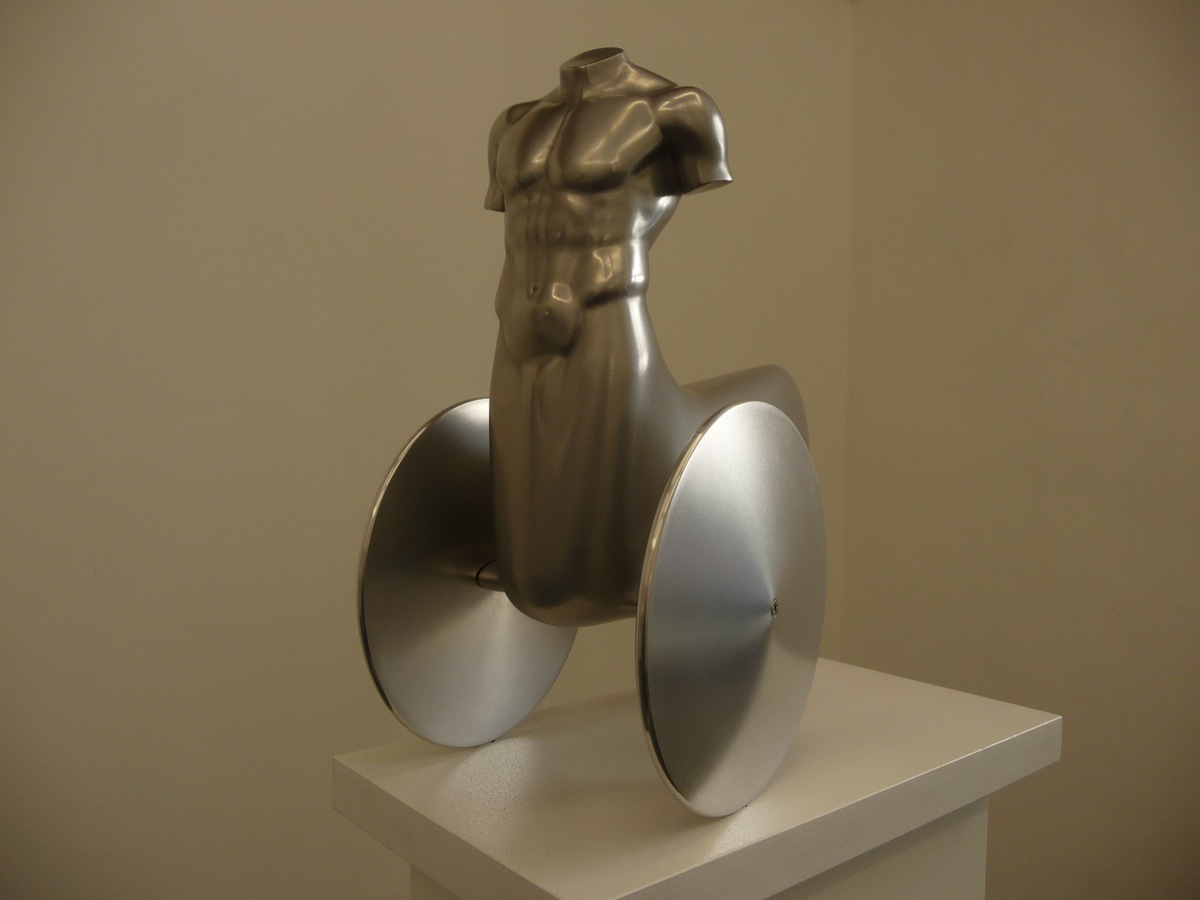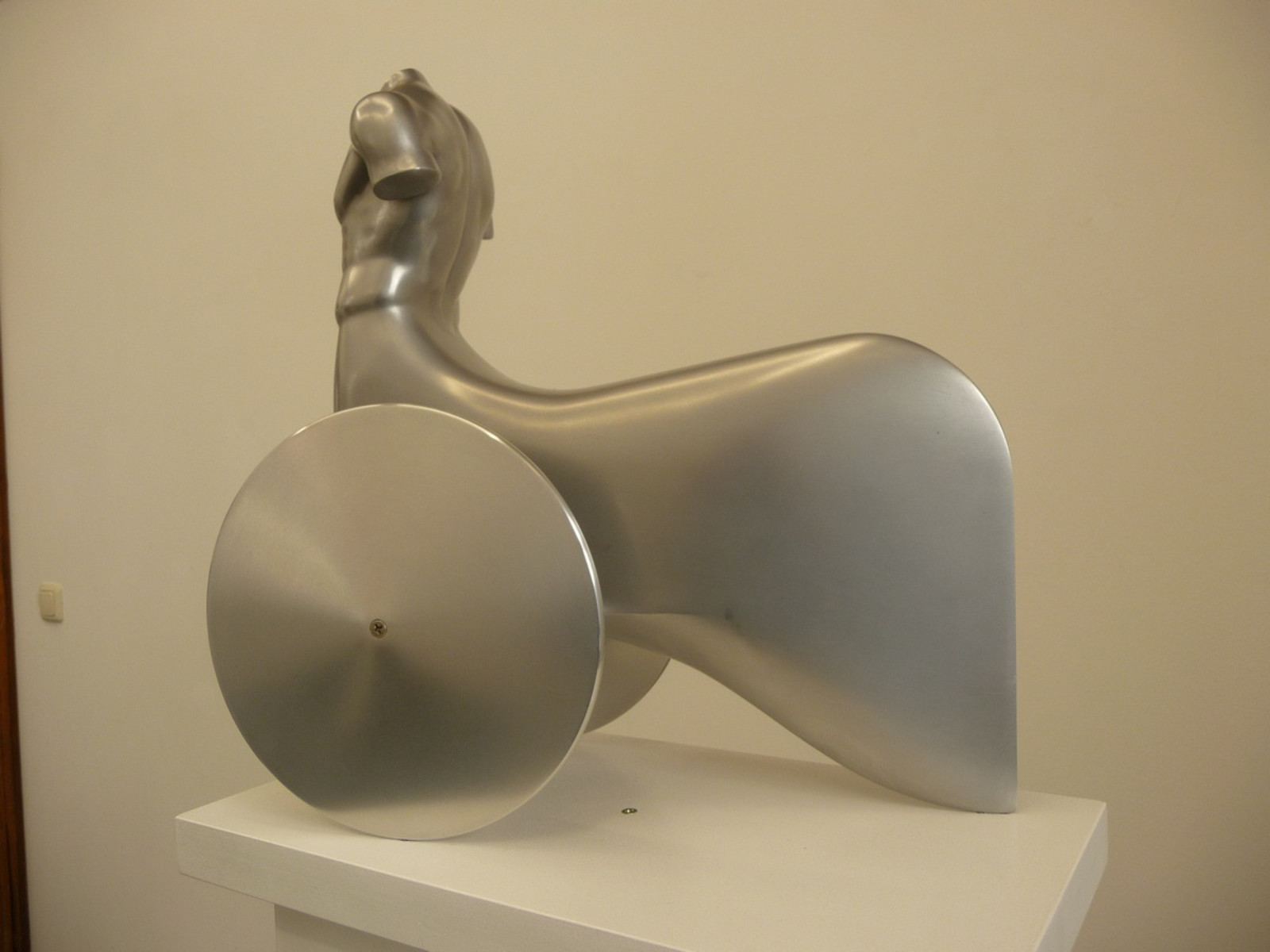 In seinem Atelier am Münchner Königsplatz entstehen die futuristisch anmutenden Gebilde – jedoch etwas an ihnen weist auch weit zurück in die Vergangenheit. Die griechisch/römischen Statuen der Glyptothek sind eine wichtige Quelle der Inspiration und zum Teil direktes Vorbild dieser Menschmaschinen. Aus Aluminiumplatten geformt und wie im Flugzeugbau vernietet und verschraubt, fließen Torsi und aerodynamische Formen organisch ineinander über. Stromlinie und Aluminium, Form und Material der Geschwindigkeit des mobilen Zeitalters, Ausdruck einer rasanten Entwicklung, die die Menschheit in kürzester Zeit von der Pferdekutsche ins Düsen- und Computerzeitalter katapultiert hat. Bergmann’s Skulpturen sind Metaphern dieser immensen Beschleunigung in ihrer ganzen Zwiespältigkeit.