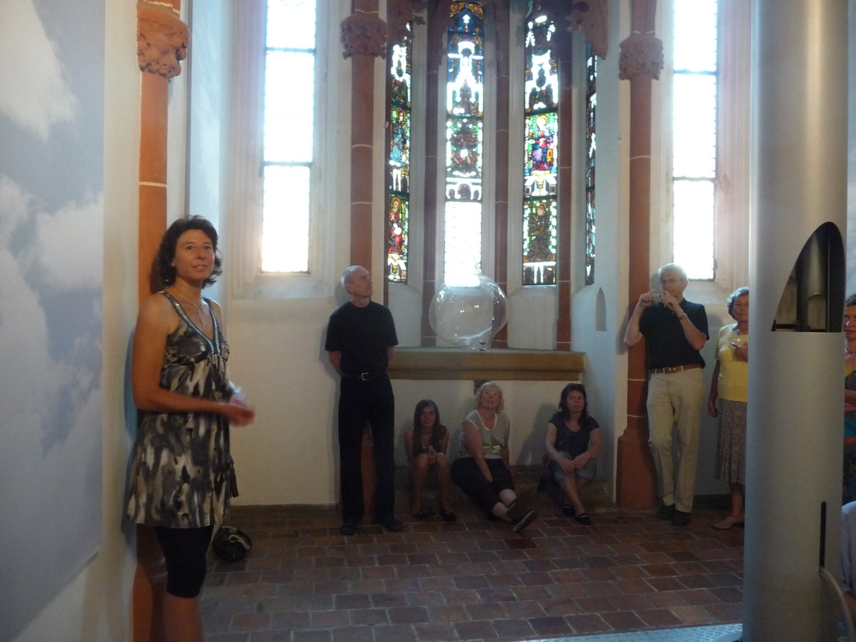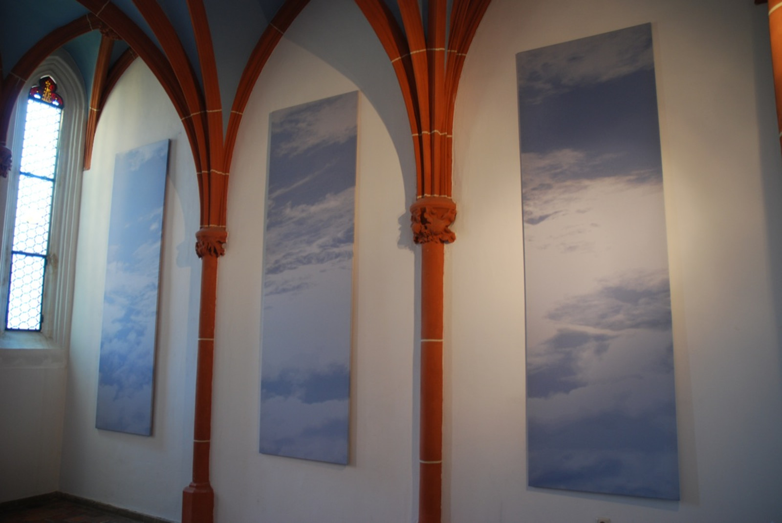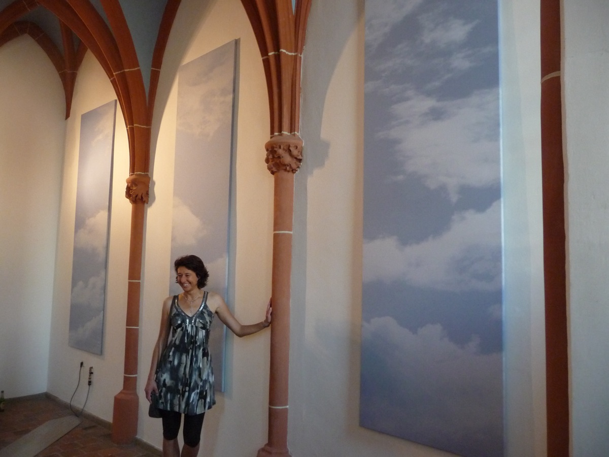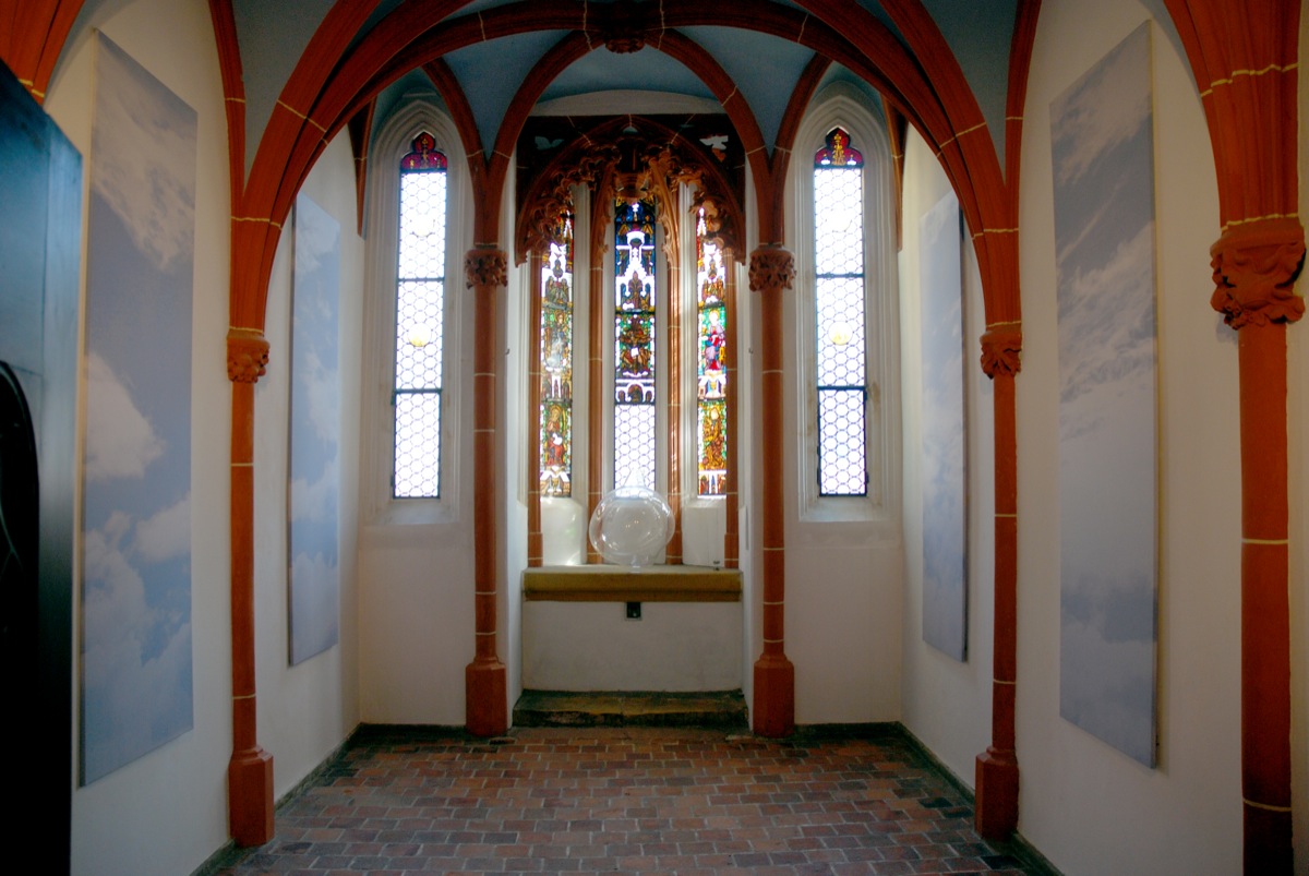 Die Insatllation "himmelwärts" von Sonja Weber in der gotischen Hauskappelle des Luftmuseums in Amberg besteht aus sechs gleichgroßen gewebten Wolkenstelen.