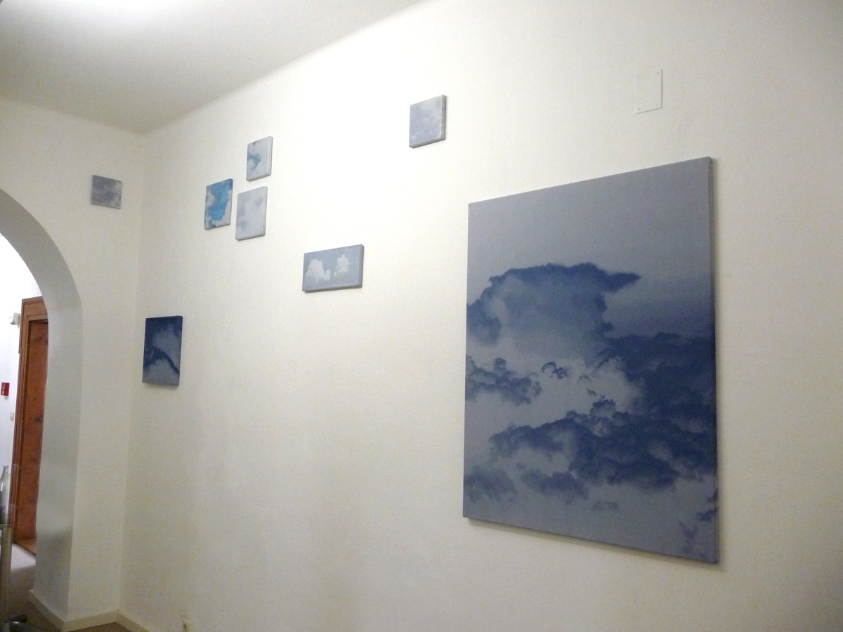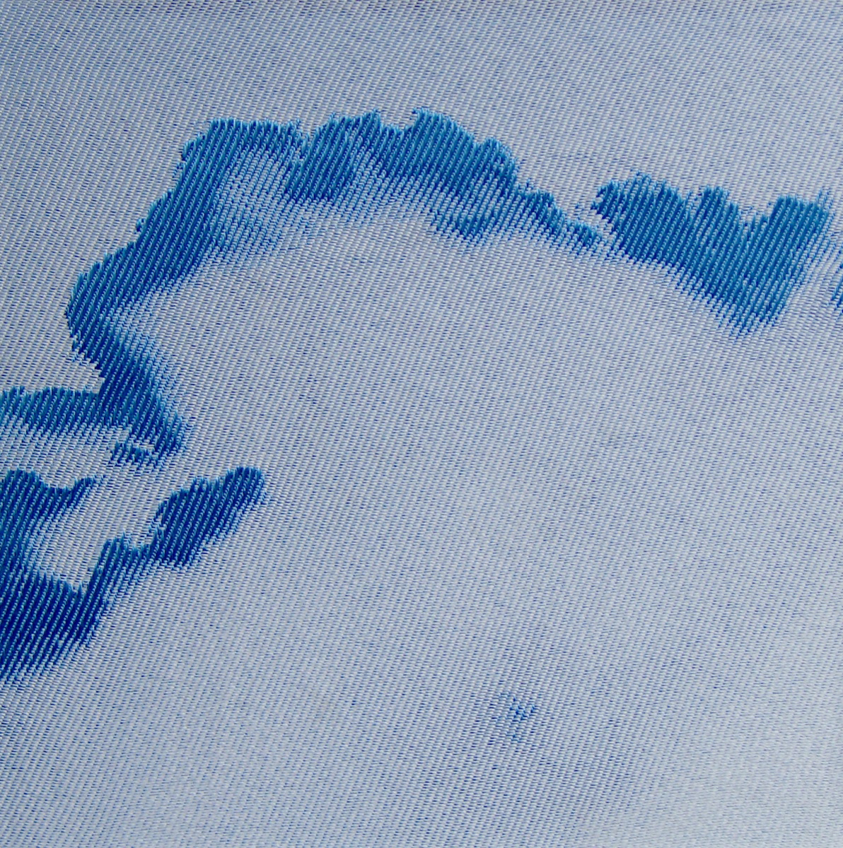 Die sechs Wolken-Stehlen sind ein Jacquardgewebe, das von der Künslterin erstellt und auf einen Keilrahmen aufgespannt wurde. Allerdings ist im Gegensatz zur Malerei die Bildoberfläche nicht zwei - sondern dreidimensional, da die einzelnen Fäden eine Art Relief bilden. Je nach Lichteinfall, Tageszeit oder Standpunkt des Bildbetrachters verändert sich die Bildoberfläche und somit der Gesamteindruck . Die changierende und somit sich ständig verändernde Bildoberfläche greift den Charakter der am Himmel vorbeiziehenden Wolken auf - sie verdichten oder verflüchtigen sich innerhalb kürzester Zeit, formieren sich ständig neu und wirken oftmmals wie "dahingehaucht".