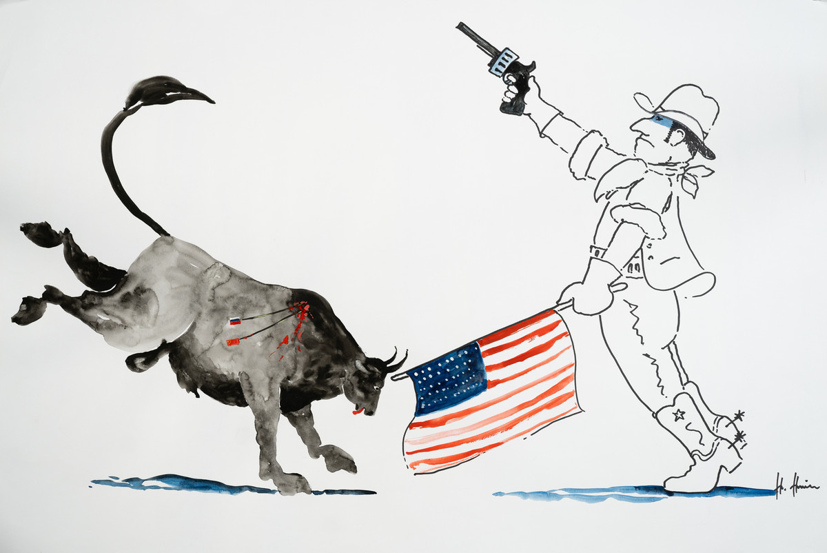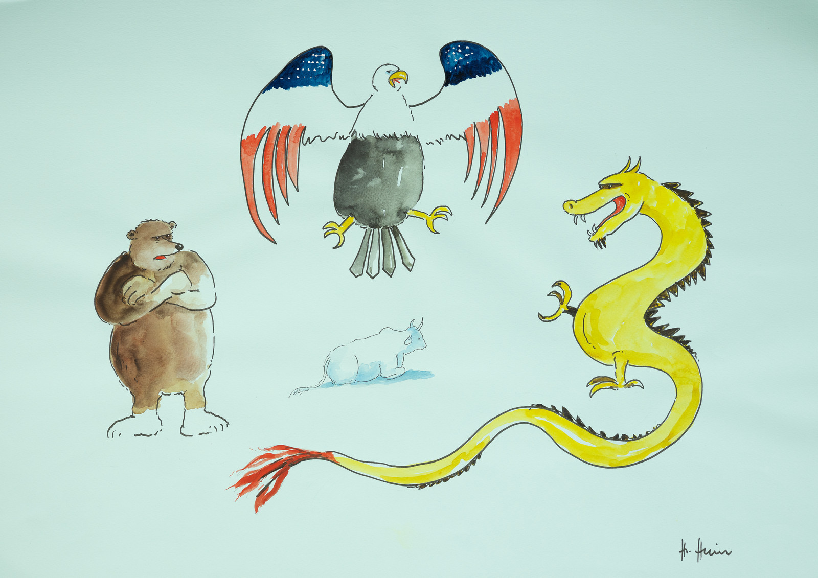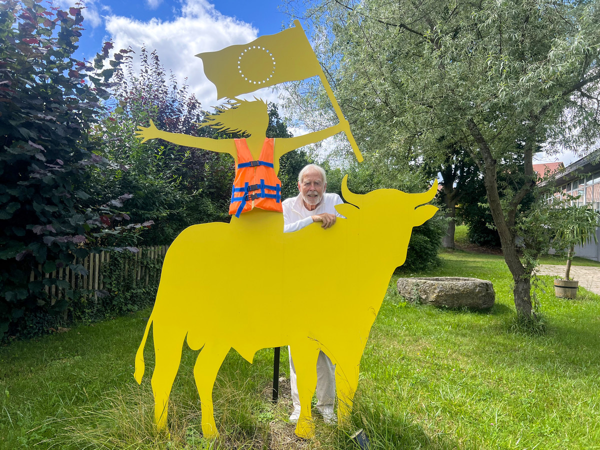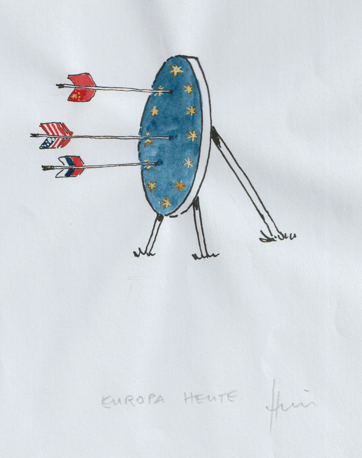 Helme Heine , der jüngst verstorbene, weltbekannte Künstler und Illustrator, hat immer wieder Werke geschaffen, die das Thema Europa behandeln. In einer Zeit zunehmender nationalistischer Strömungen und europäischer Krisen kommt diese Ausstellung also genau zur richtigen Zeit: In einer Zeit, in der Europa vor großen politischen und sozialen Herausforderungen steht, zeigt Heine, wie Kunst eine Brücke schlagen kann – zwischen Ländern und Kulturen, zwischen Vergangenheit und Zukunft, zwischen ernsten politischen Themen und einer hoffnungsvollen, humorvollen Vision einer vereinten, friedlichen Gemeinschaft. Die Ausstellung „EUROPA“ wird im Tempel-Museum Etsdorf exklusiv und erstmals zu sehen sein. Die hier gezeigten Bilder, Collagen, Zeichnungen und Texte entstanden 2024 und 2025 und sind somit die spätesten künstlerischen Zeugnisse des am 20. November 2025 in Russell, Neuseeland, verstorbenen Künstlers, der sich hier auch ganz konkret politisch äußert. Vor allem das Verhältnis von Europa zu den USA ist immer wieder ein Thema der neuen Arbeiten. „Die Welt befindet sich in einem ungeheuren Wandel. Das Gestern, das Vertraute, das Liebgewordene schwindet. Das Heute schafft unaufhörlich Neues. Das Morgen ängstigt“, so hat es der Künstler formuliert. Aber auch: „Nehmen wir es mit Humor. Das Wasser steht uns bis zum Hals. Jetzt sollten wir nicht noch den Kopf hängen lassen.“ Immer wieder ist der Stier selbst ein Sujet für Heine: Er steht für jene Kräfte des Wandels, die uns begleiten: Migration, Handel, kulturelle Begegnung, aber auch politische Spannungen und unerwartete Umbrüche. Europa besteigt den Stier nicht aus Naivität, sondern aus einer Art Vertrauen in die Möglichkeit des Neuen. So gesehen erzählt der Mythos nicht nur von einer göttlichen List, sondern von einer Geburt – der Geburt eines Kulturraumes, der sich seit Jahrtausenden aus vielen Stimmen, Sprachen und Traditionen zusammensetzt. Helme Heine will uns mit dieser Ausstellung sagen: Was in der Sage begann, ist heute ein lebendiges Projekt: Europa bleibt ein Wagnis. Aber es ist, trotz allem, eines, das sich lohnt.