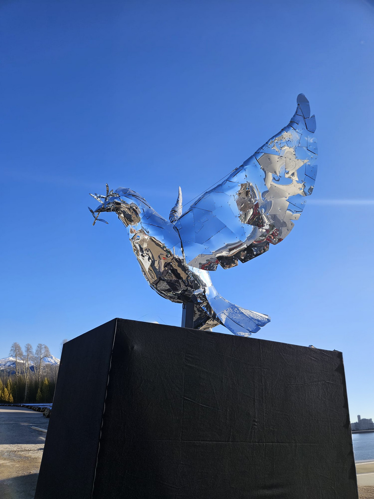 Erstmals realisiert für das Winter Tollwood Festival 2025 auf der Theresienwiese in München, ist die Friedenstaube als wandernde Skulptur konzipiert. Gefertigt ist die Skulptur aus Spiegel-Alu-Dibond, einem Material, das je nach Lichtsituation sehr unterschiedliche visuelle Eindrücke erzeugt. Bei Tageslicht reflektiert die Oberfläche Himmel, Wolken, Vegetation sowie die Bewegungen der Menschen. Die Taube scheint ihre Umgebung aufzunehmen und wird selbst Teil des Raumes.